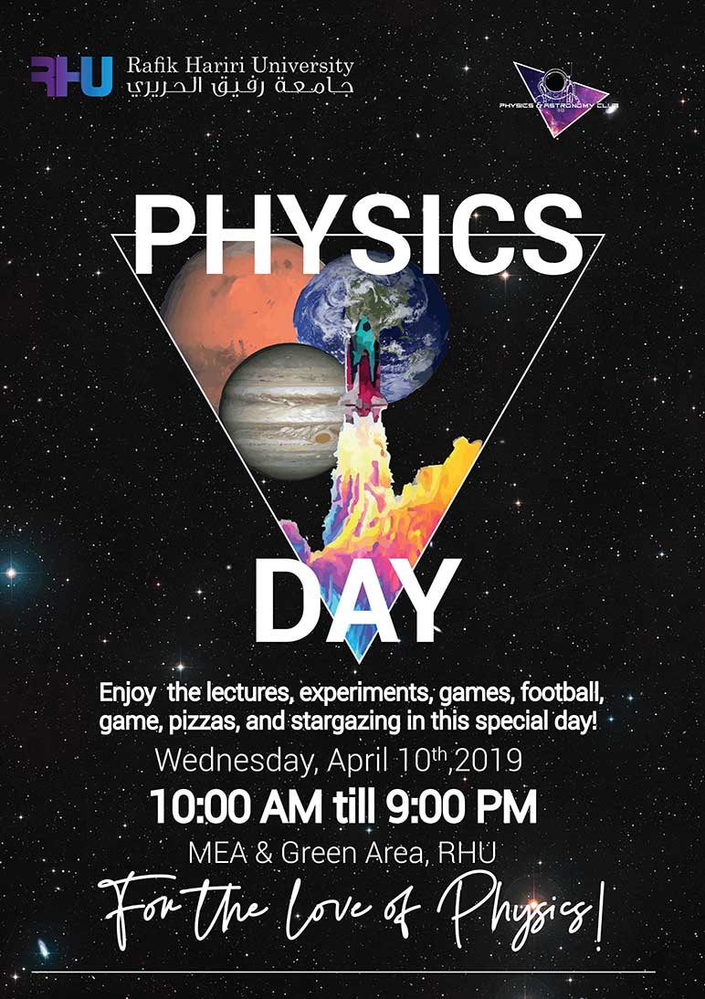 Description: Physics fans, rejoice! RHU physics enthusiasts represented by the RHU Physics and Astronomy Club are celebrating on April 10th with fun physics demonstrations, public lectures, and other science events.