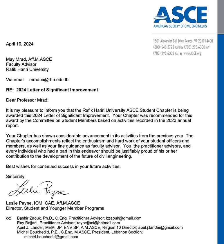 The ASCE RHU Student Chapter in the Civil and Environmental Engineering Department was awarded the 2024 Letter of Significant Improvement. The Committee on Student Members recommended the chapter for this award based on the activities recorded in the 2023 annual report.