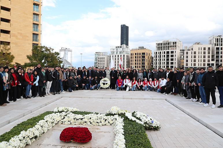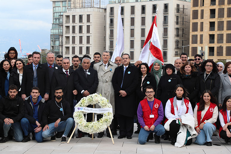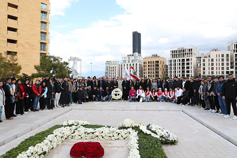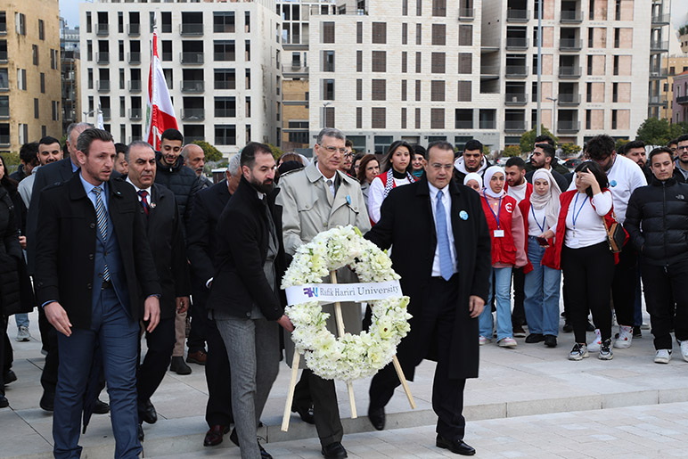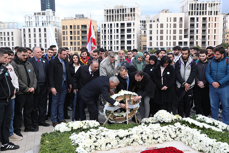 On the solemn occasion marking the 20th anniversary of the tragic assassination of former Prime Minister Rafik Hariri, the RHU community gathered to honor his enduring legacy. RHU President, Dr. Said Ladki, Administrative Board Members, Faculty, Students, and Staff visited his memorial shrine, where they laid a wreath of white roses as a symbol of remembrance and respect.