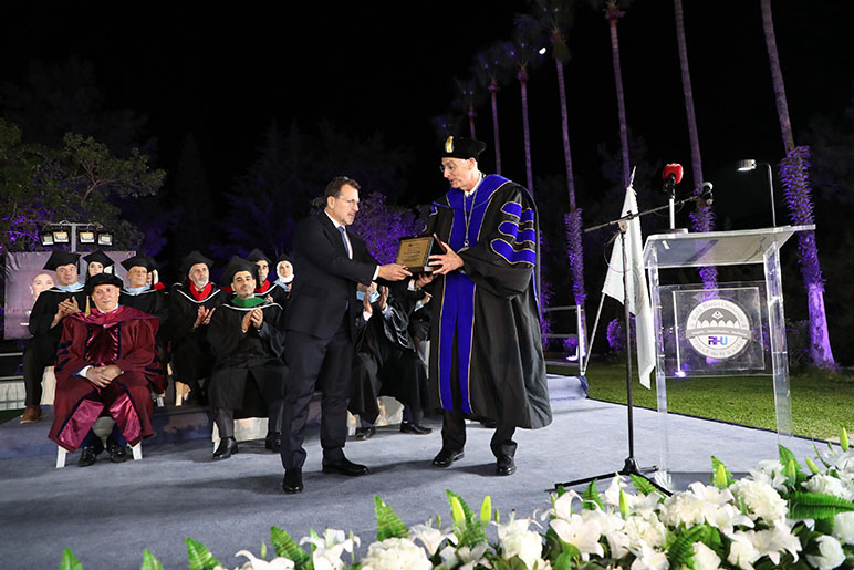 To recognize his participation, RHU President Dr. Said Ladki presented an award plaque to HE Dr. Chehade, honoring his contribution to the 25th Anniversary Celebration and his support of RHU’s mission.