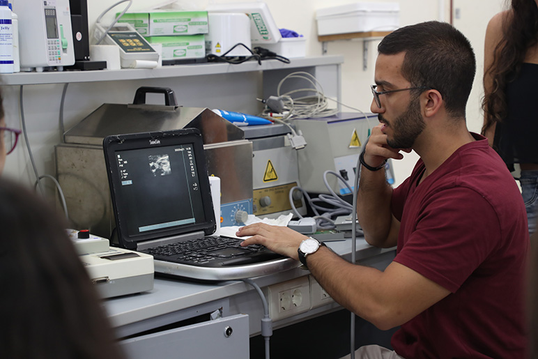 During the demonstration, students visualized the vessels in the neck (carotid artery, internal and external jugulars, and the brachial). They also overviewed different imaging modes, M-Mode, B-Mode, Dopper and Colour Doppler, and different settings for near and far field gains, depth, penetration vs resolution, and exam types. Students gave it a shot to explore their own vascularity.