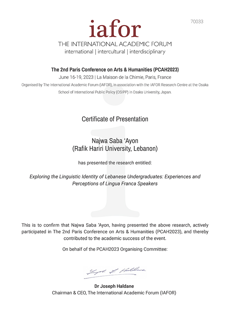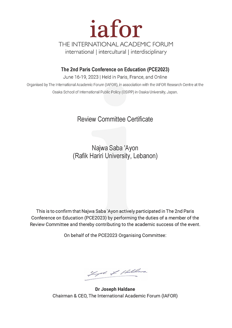 Dr. Saba ‘Ayon Fares was also recognized for serving as a member of the review committee at the iafor Paris Conference on Education (PCE 2023).