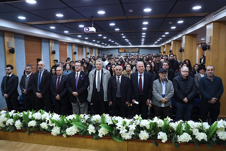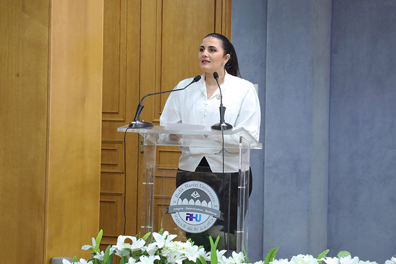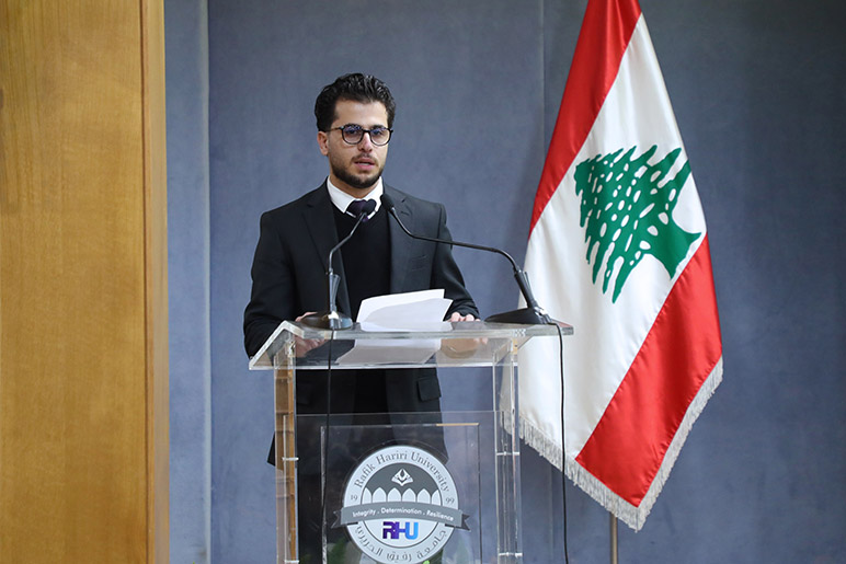 The ceremony began with remarks from Associate Director of Student Affairs Mrs. Sahar Hallak, followed by a moment of silence, the Lebanese National Anthem, and RHU Alma Mater. Student participation included an address by SRC representative Mr. Omar Abdel Wahed, who emphasized the vital role of youth in promoting the founder’s vision, reflecting on the profound national and institutional impact of Martyr Hariri’s leadership.
