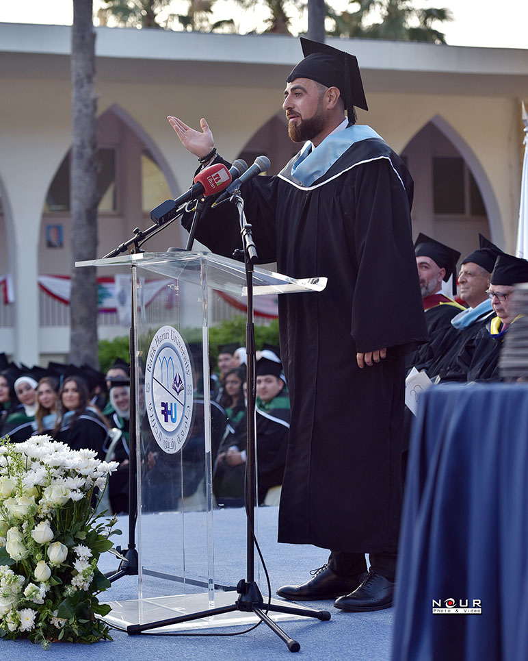 The degree ceremony began with the Lebanese National Anthem and a moment of silence in memory of RHU Founder the late Prime Minister Martyr Rafik Hariri. RHU faculty member and master of ceremony Dr. Houssam Salami gave the welcoming address and invited the graduating class representative Kasem Faour and the postgraduate class representative Bilal Aridi to give their speeches. For both speakers, the days they spent at RHU leading up to Commencement were as reflective as they were triumphant. They both expressed deep appreciation of the exceptional RHU education and the remarkable dedication of RHU faculty members in equipping them with the knowledge and skills to be ready to connect to a world of opportunities.